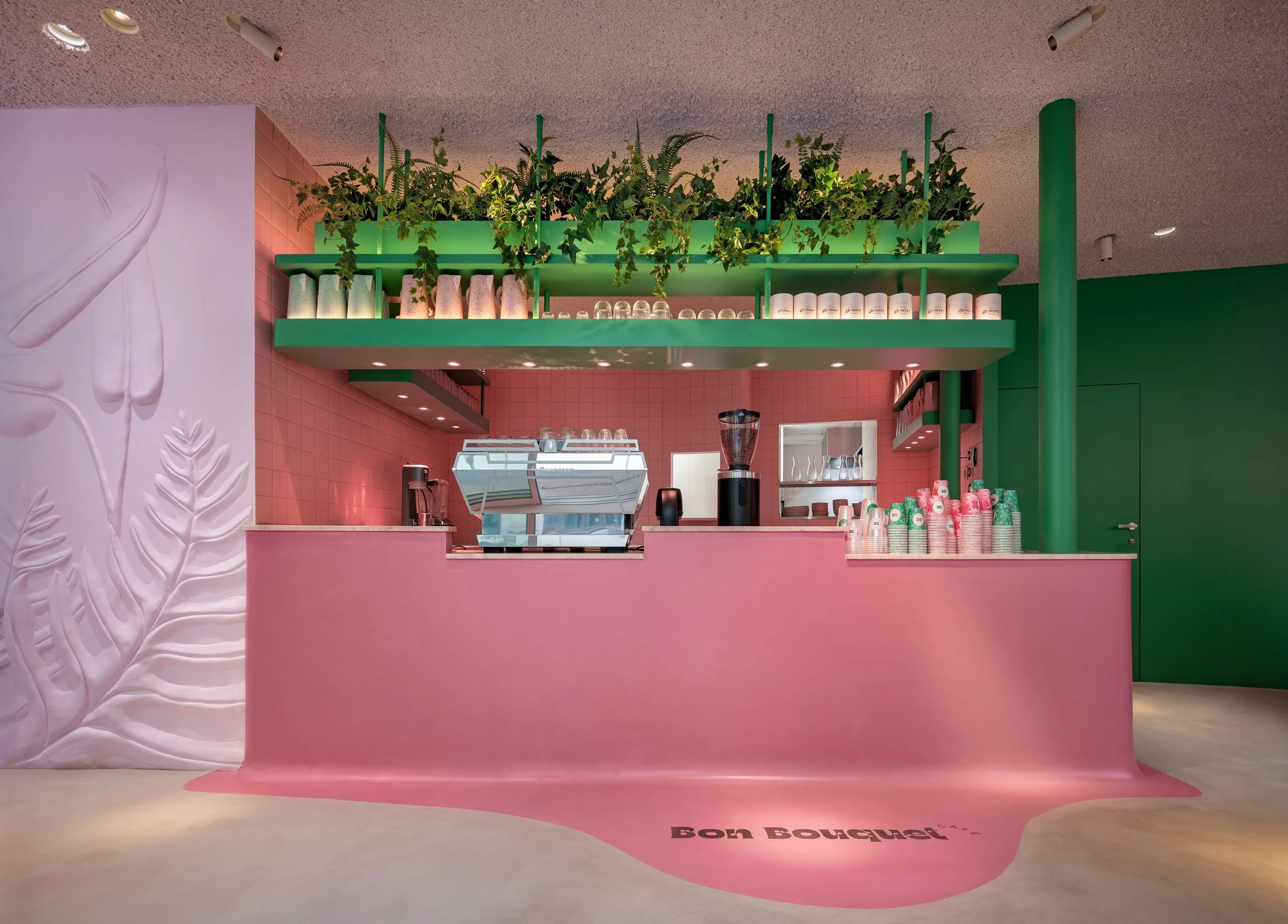 The café's colour palette is dominated by shades of pink, which are complemented by lush greenery. This combination creates a dynamic and inviting atmosphere.