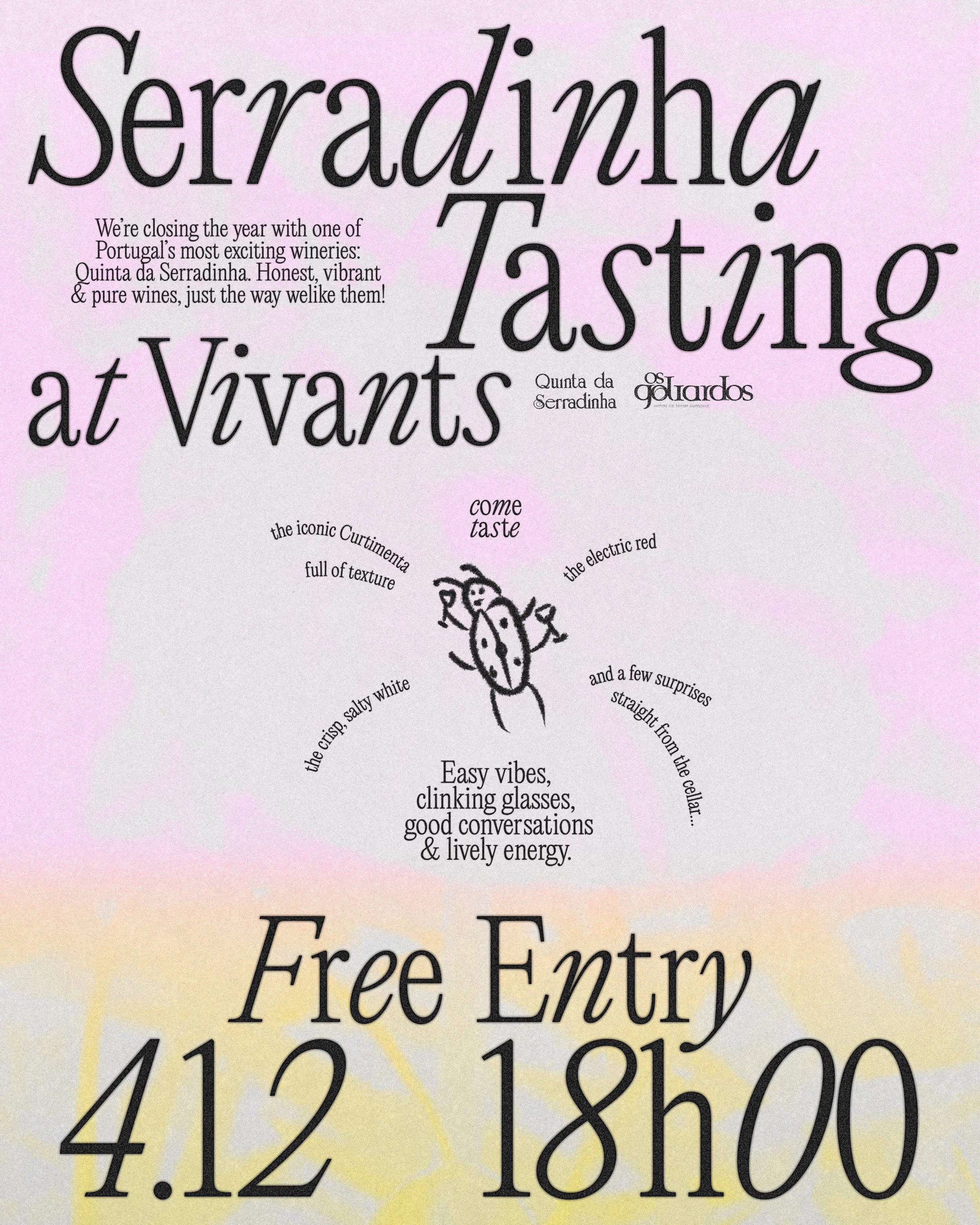 Enjoy Serradinha wine at Vivants on December 4th — free entry, lively energy, and some of Portugal’s most exciting wines.