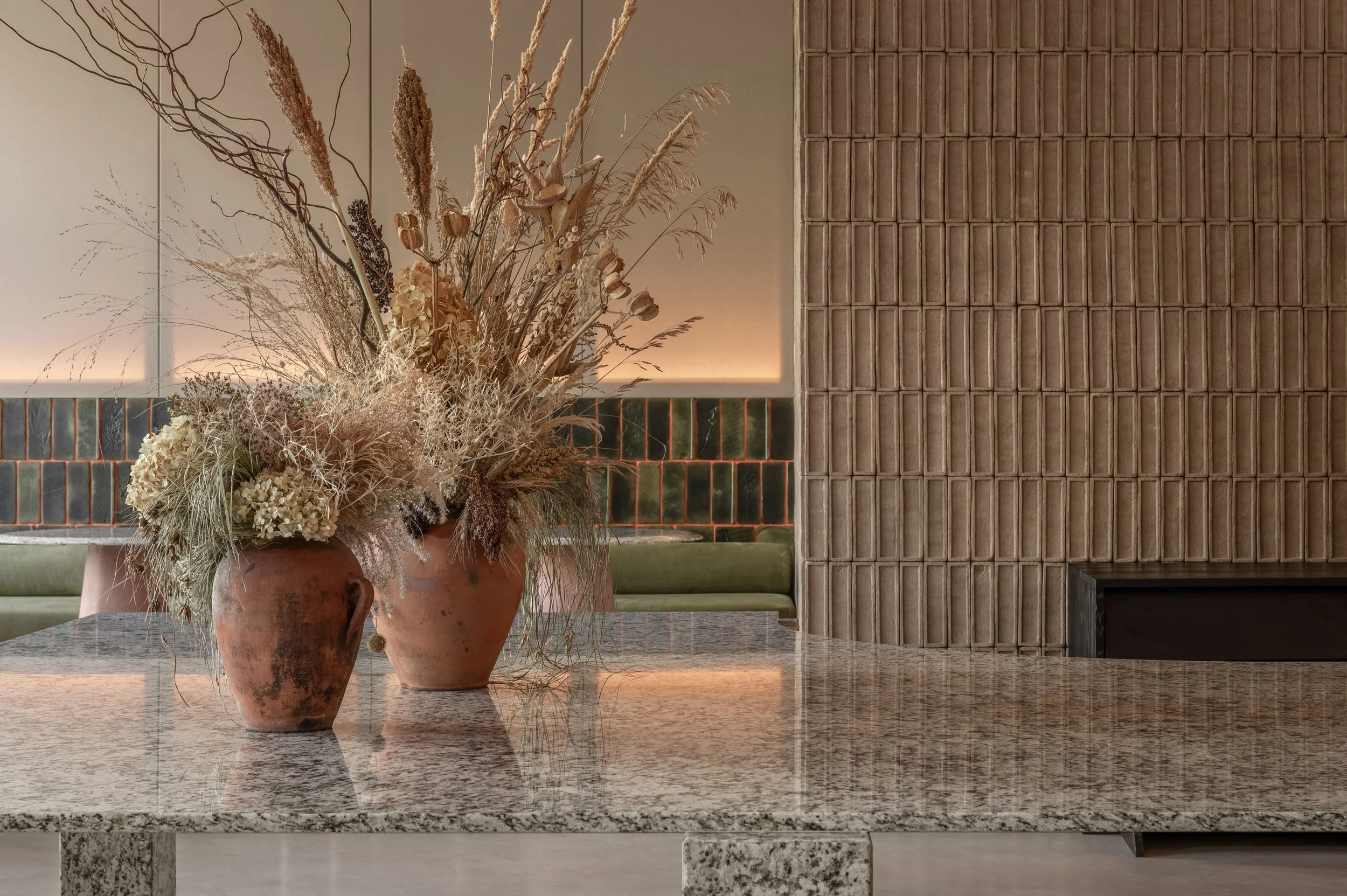 But the storytelling does not stop at the table. The interiors are equally rich in meaning: decorative tiles pressed with wildflower imprints, handmade by Ukrainian ceramicists; textured clay walls inspired by traditional village huts; and bespoke furniture created by regional masters.